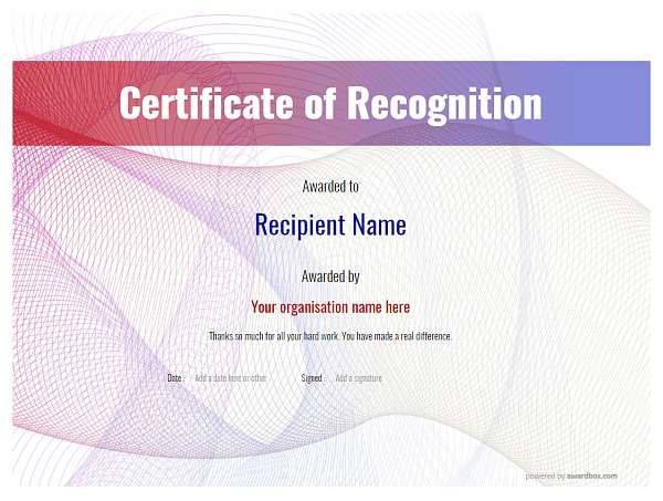 In these busy times of high expectations in so many walks of life including our personal ones, it is always good to receive recognition for our efforts and abilities. By creating a certificate of recognition from a template here you have the opportunity to give great motivation to your recipient. If you are in a more formal environment such as a sports coach or providing accredited training then a recognition certificate can provide evidence of acquired knowledge and skills. Attributes such as contribution, exceptional levels of effort, and high levels of excellence are all in need of award by recognition with a certificate. This will give a long-lasting memory of achievement for either employees or friends and family to see and celebrate. If you are running a campaign or work-based initiative, why not create a set of recognition certificates as prizes or goals?